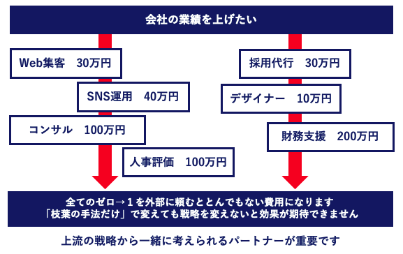 業績を上げるためには枝葉の手段ではなく、抜本的な経営戦略から考え、組織・人事・営業・マーケティング・財務・商品戦略に落とし込んで行かなければなりません。しかし、自社のことは自社が1番よくわかっておりません。強みやビジネスチャンスの整理から経営戦略を考えることが大切で、その後に手段が重要なのですが、社内人材の場合手段ばかりに目が向いてしまう傾向があり、外部の支援者を活用することで第三者の視点から戦略等の上流視点から経営戦略を策定していきます。